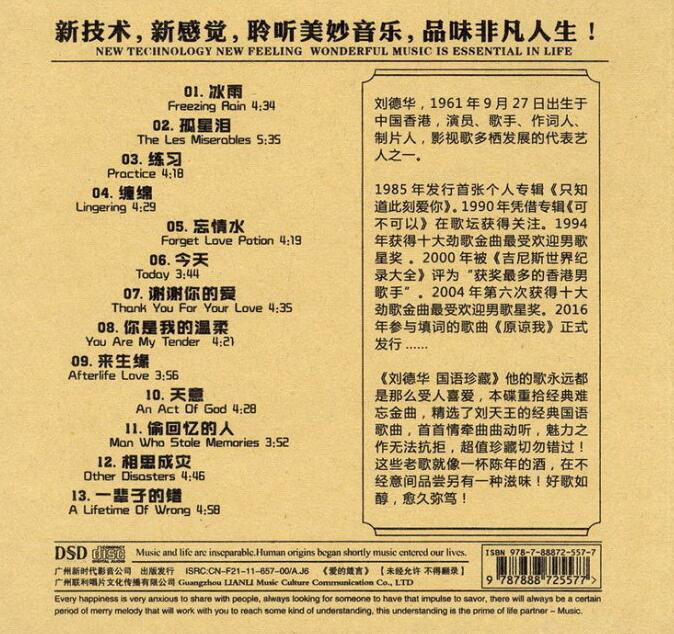 专辑收录了刘德华十三首国语老歌,传听传唱之绝对经典珍藏。本碟重拾经典难忘金曲,精选了刘天王的经典国语歌曲,首首情牵曲曲动听,魅力之作无法抗拒,超值珍藏。曲目:01.冰雨02.孤星泪03.练习04.缠绵05.忘情水06.今天07.谢谢你的爱08.你是我的温柔09.来生缘10.天意11.偷回忆的人12.相思成灾13.一辈子的错音乐资源下载地址:(网盘资源该怎么下载)点击下载无损音乐专辑CD